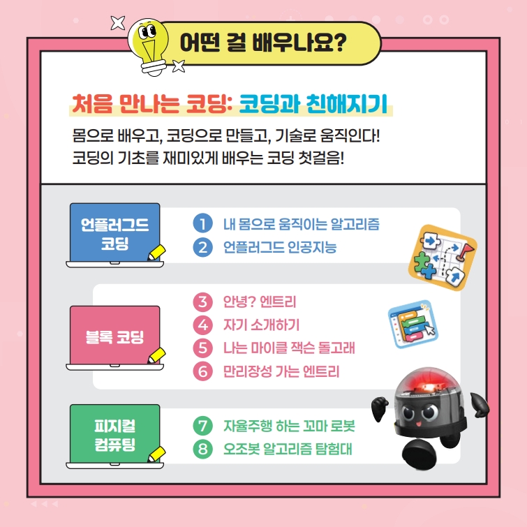 ★ 본 과정은 언플로그드 코딩으로 알고리즘을 익히고, 엔트리 블록코딩으로 실습하고, 컬러 로봇 코딩으로 피지컬 코딩까지 체험하는 소프트웨어를 처음 접하는 초등 1~2학년을 위한 과정(8차시, 4주간 과정)입니다. ★